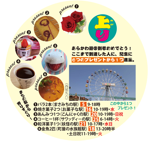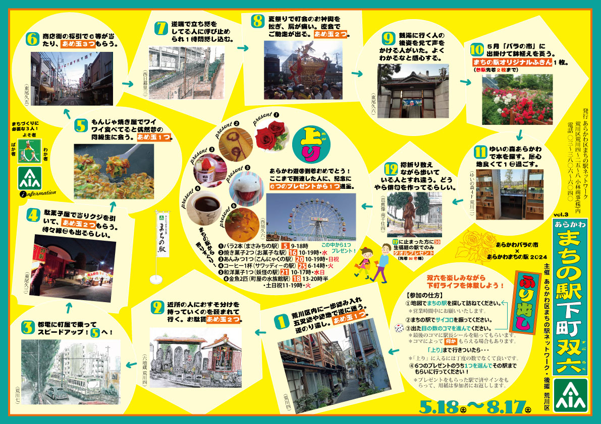 終了 あらかわ まちの駅下町双六 2024 2024年5月18日〜8月17日 2024年も「双六」vol.3を開催。参加者が振るサイコロの目の数によって、進み具合が違います。双六をしながら下町を体験できるまちの駅巡りイベント。コマによっては景品がありますし、「上り」でも選べるプレゼント進呈。「バラの市盛り上げ隊」にも参加しました。 主催:あらかわ区まちの駅ネットワーク 後援:荒川区 主催 あらかわ区まちの駅ネットワーク 後援 荒川区 イベント資料