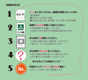 終了 謎解きまちの駅あらかわめぐり 2025年5月17日〜8月9日 荒川区内の下町らしさを体感しつつ、謎解きをしてもらうイベント。まちの駅へ行って荒川区と各駅の謎を解いたら、まちの駅缶バッチかあめ玉を進呈。 主催 あらかわ区まちの駅ネットワーク 後援 荒川区 イベント資料